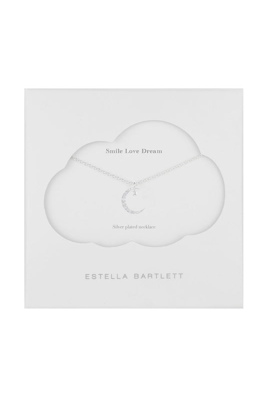 Beautifully sparkling silver plated necklace, featuring a crescent moon and tiny hanging star. Presented on a quote card - 'Love you to the moon and back'