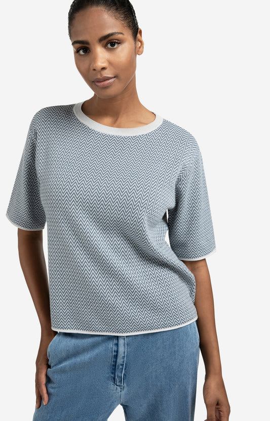 This jacquard-knit features a crew neckline, short sleeves, and a loose fit. The two-tone zigzag pattern adds a modern and playful touch. The solid trims at the collar, sleeves, and hem provide a clean and stylish finish. Its soft knitted texture makes it ideal for a casual look with a contemporary edge.